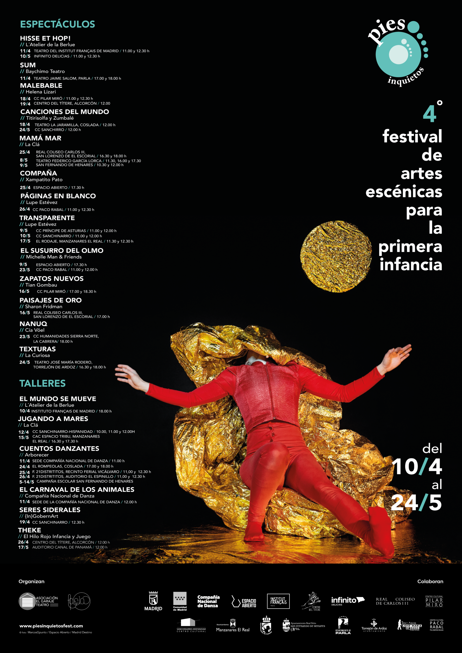 La cuarta edición de nuestro festival se desarrollará entre el 10 de abril y el 24 de mayo en la Comunidad de Madrid. Estará compuesto por 13 espectáculos y seis talleres para niños y niñas de 0 a 6 años. El festival se realizará en 9 municipios de la Comunidad de Madrid.